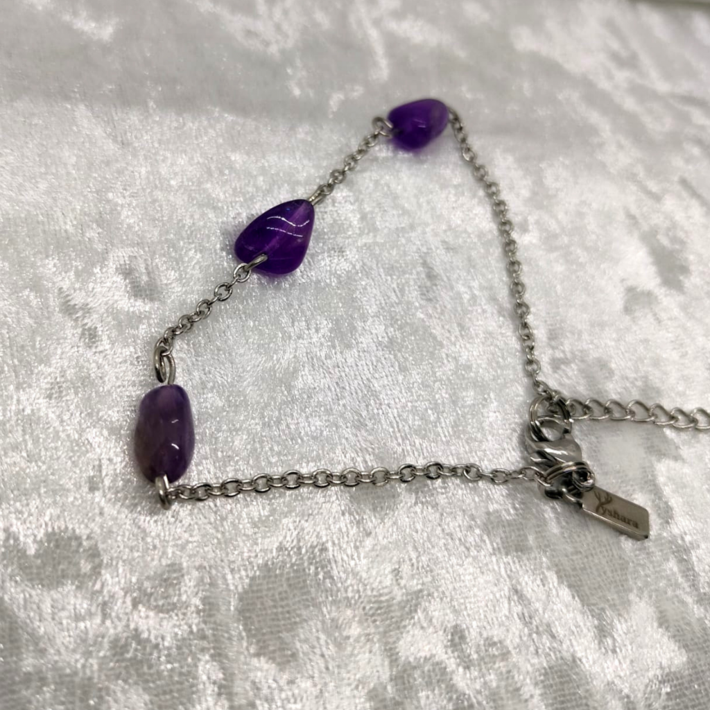 Trois perles d’améthyste posées sur une chaîne argentée dessinent un halo léger autour du poignet.