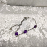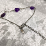 Trois perles d’améthyste posées sur une chaîne argentée dessinent un halo léger autour du poignet.