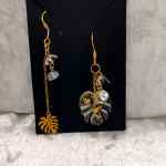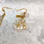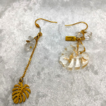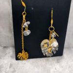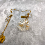 Sur l’une, une feuille stylisée en résine transparente, traversée d’éclats de feuille d’or, capte la lumière comme une rosée figée. Sur l’autre, une breloque feuille dorée se balance au bout d’une fine chaîne. Des éclats de cristal de roche apportent netteté et amplitude énergétique. L’ensemble en acier inoxydable doré pose une présence délicate et lumineuse, facile à porter au quotidien.