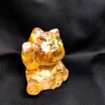 Neko Rosa par Tyshara. Chat porte-bonheur en résine avec bouton de rose, quartz rose, romarin et feuilles d’or. Talisman décoratif de douceur protectrice et d’abondance lumineuse. 4,5 × 6,5 cm, 78 g.