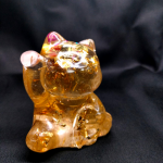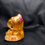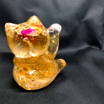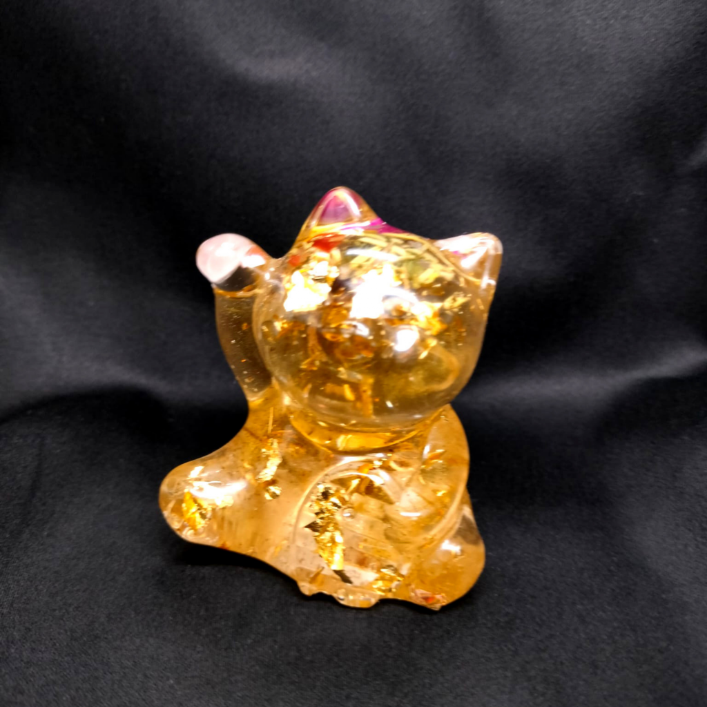 Neko Rosa est façonné en résine claire et infusé d’un bouton de rose, de quartz rose, de romarin et d’éclats de feuilles d’or. De petites étoiles se sont glissées sous la surface, comme des vœux déjà exaucés.