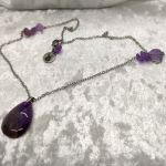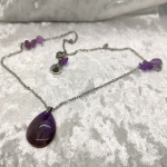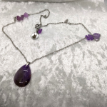 Goutte d’améthyste et éclats sur chaîne argentée. Intuition claire, calme protecteur.