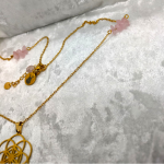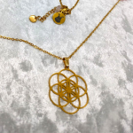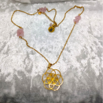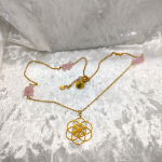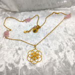 Collier ajustable en acier doré avec Fleur de Vie et quartz rose. Douceur du cœur, harmonie qui circule. Longueur 52 à 57 cm.