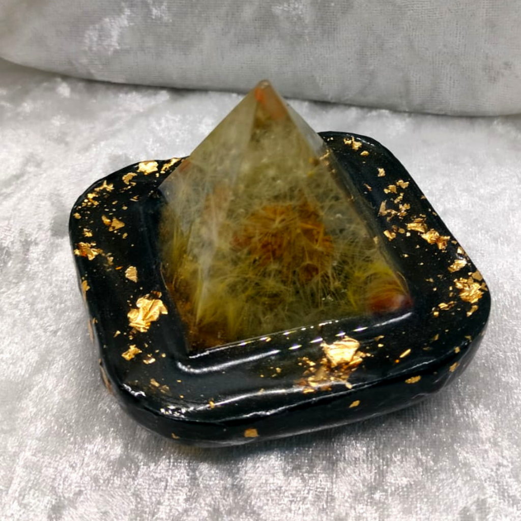 Au cœur de la pyramide, une fleur de pissenlit préserve le souvenir d’un souhait. Des inclusions de cornaline irriguent l’objet d’un courage chaleureux. Les feuilles d’or réveillent l’élan. Le socle noir tient l’assise pour que le désir prenne racine sans forcer.