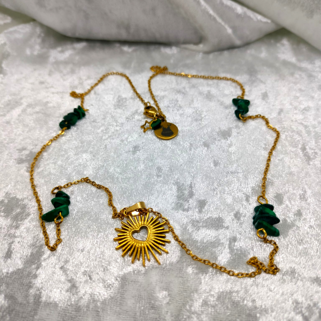 Les éclats de malachite, véritables, accompagnent les passages et apaisent ce qui s’enflamme, dans le corps comme dans le cœur.