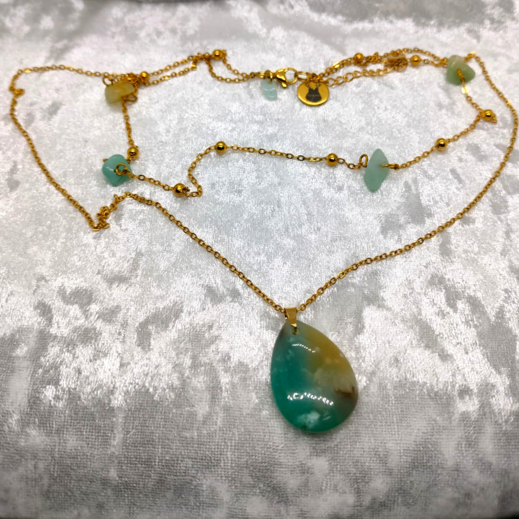 Un collier double rang comme un dialogue intérieur. Le rang court, façon tour de cou, est ponctué d’éclats d’amazonite qui posent des limites douces et accordent la voix au cœur. Le rang long porte une goutte d’amazonite veinée, eau tranquille qui descend jusqu’au sternum et ouvre la présence sans heurt. Source Jumelle harmonise expression et écoute. Ce que je dis m’appartient, ce que je reçois me nourrit.